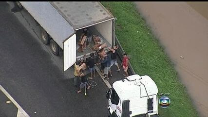 Um caminhão parado teve a carga saqueada. Assaltantes aproveitaram o engarrafamento para assaltar motoristas parados. (Assista no vídeo ao lado)