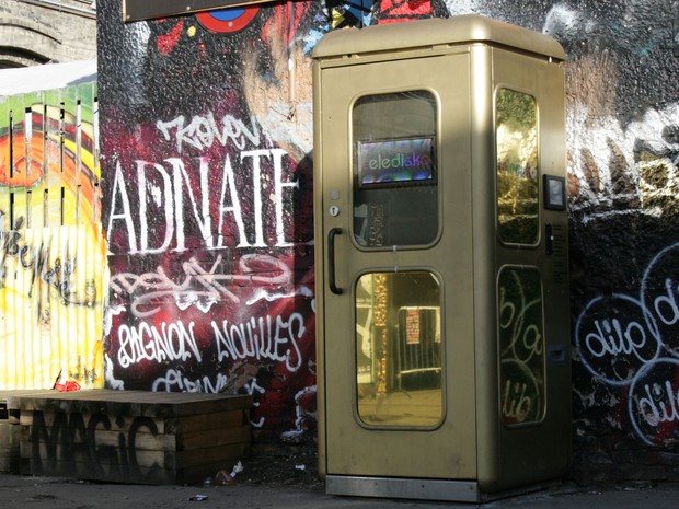 Vista de longe a cabine telefônica dourada parece ser apenas um dos últimos telefones públicos remanescentes de Berlim. Afinal, com a disseminação dos celulares, essas peças perderam sua função e as empresas de telecomunicações optaram por extinguir esse serviço. Apesar da raridade, no entanto, o que realmente atrai os olhares curiosos para essa caixa dourada é sua nova utilidade: a cabine foi transformada na menor discoteca do mundo.