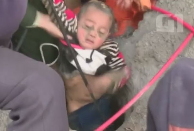 O menino acabou içado após várias tentativas. A equipe de resgate conseguiu prender a corda no braço direito da criança para poder puxá-la.